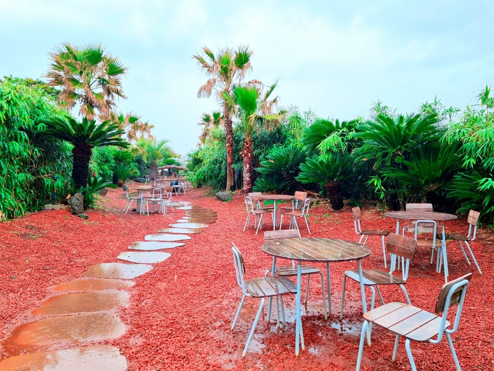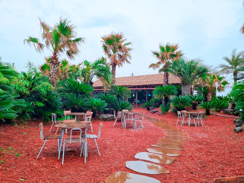비오는 날 제주도 여행, 대정읍 인스밀 카페: 붉은 화산석 위로 떨어지는 제주의 빗방울