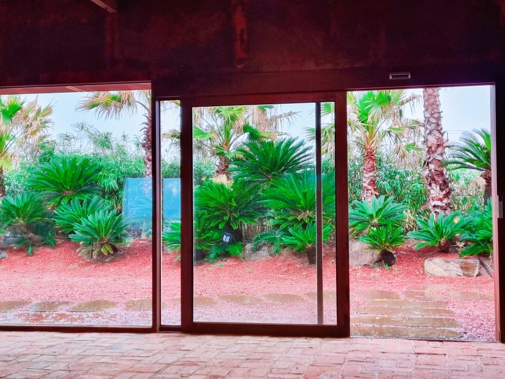 통창 밖으로 나가면 붉은 화산석과 야자수가 어우러진 정원이 있습니다.