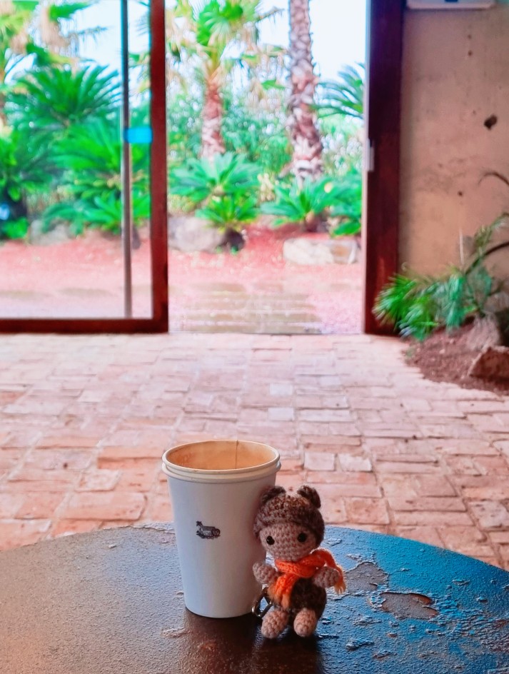 정원 쪽은 통창으로 되어있고, 그 창으로 정원의 붉은 화산석 위로 떨어지는 빗방울을 볼 수 있었습니다.