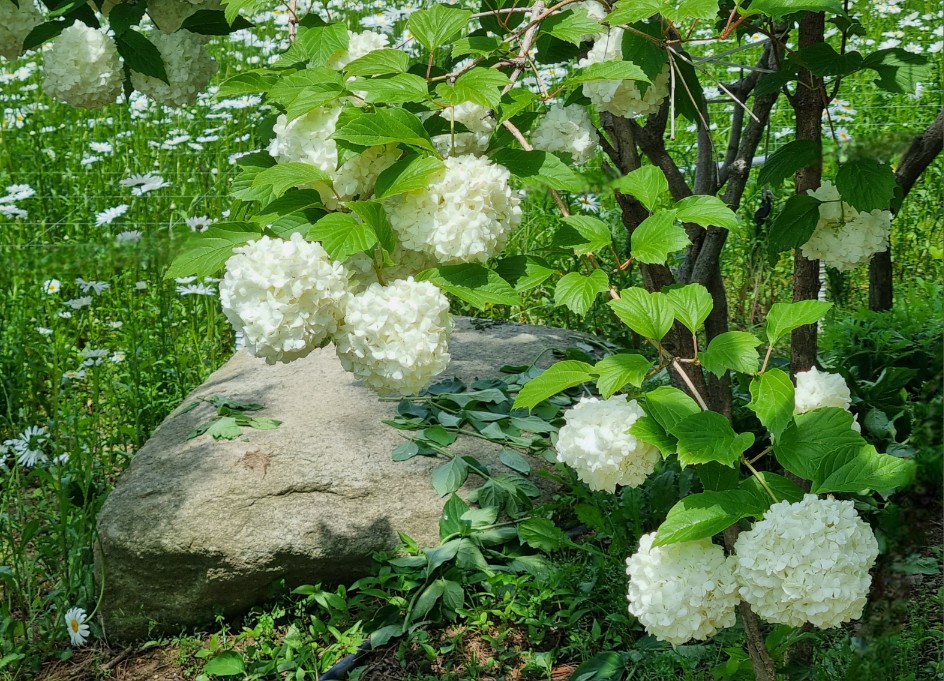 이 하얀 꽃을 보고 수국이 생각났어요. 그런데 이 꽃은 수국이 아닌 불두화입니다.