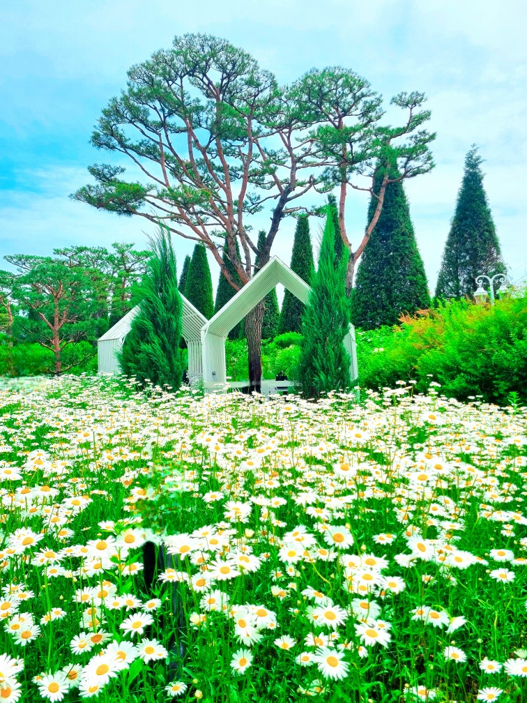 이 하얀 데이지꽃에 있는 저 하얀 오두막 참 잘 어울리는 것 같아요.